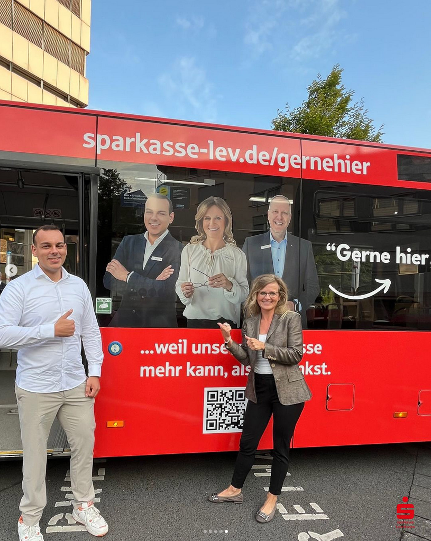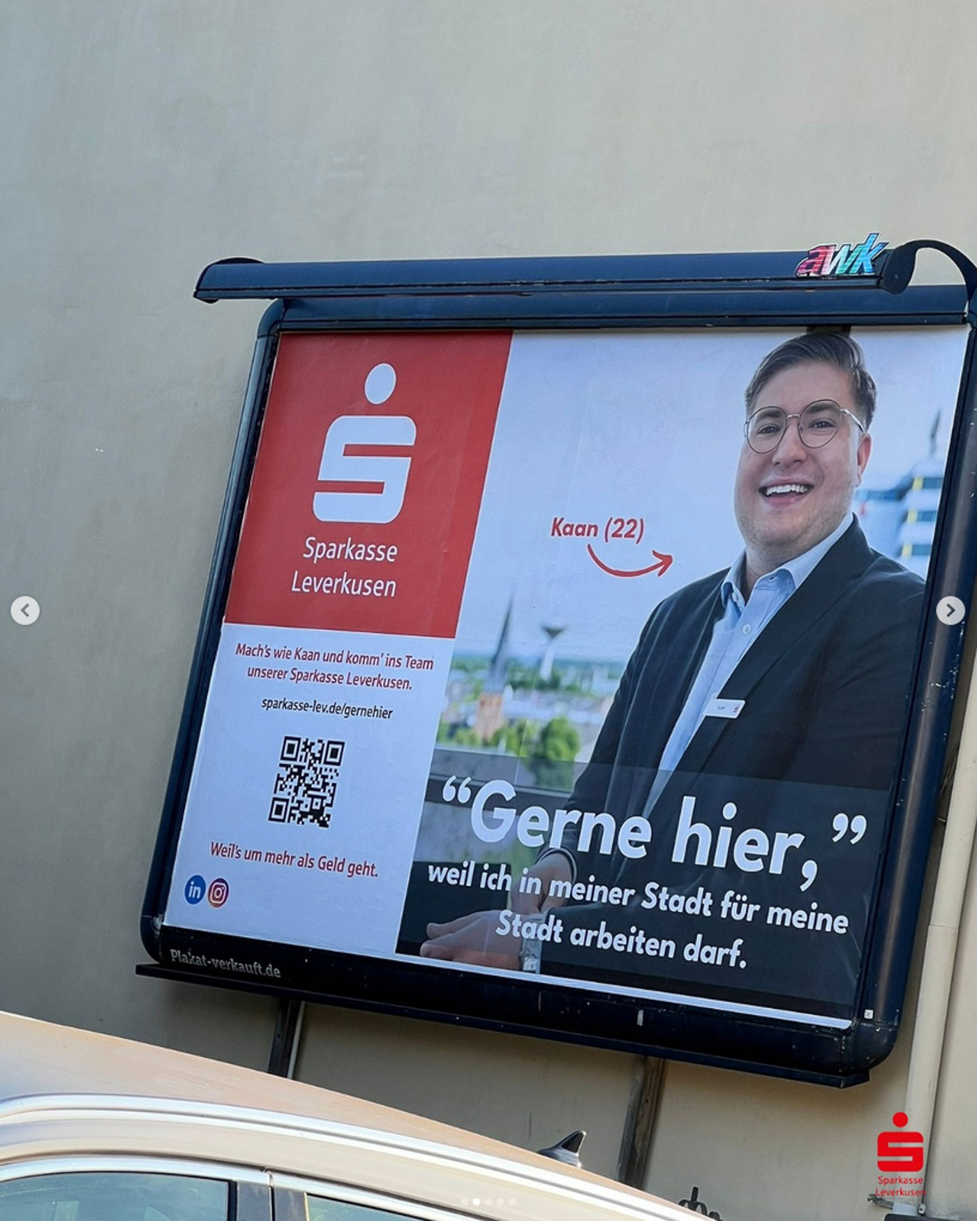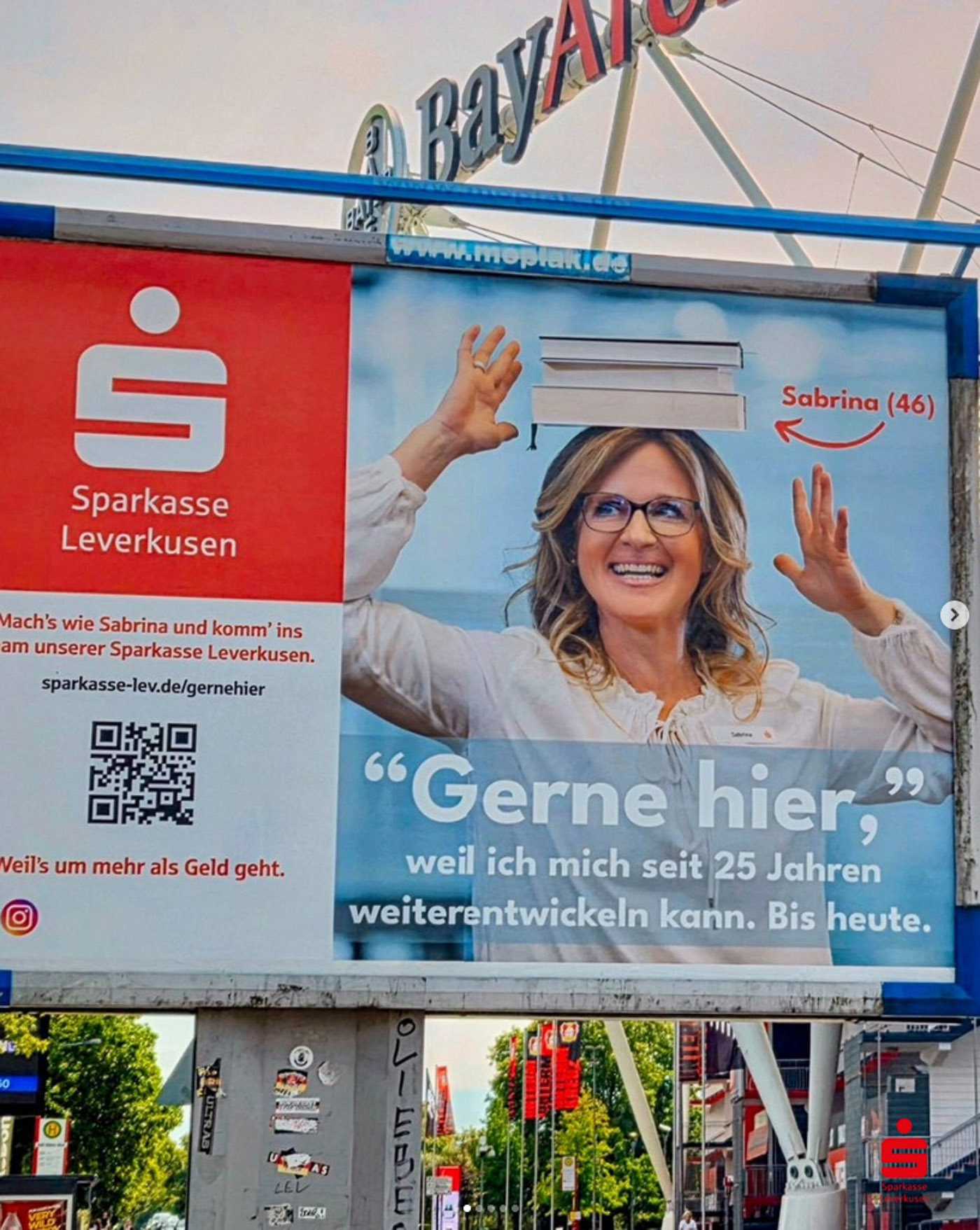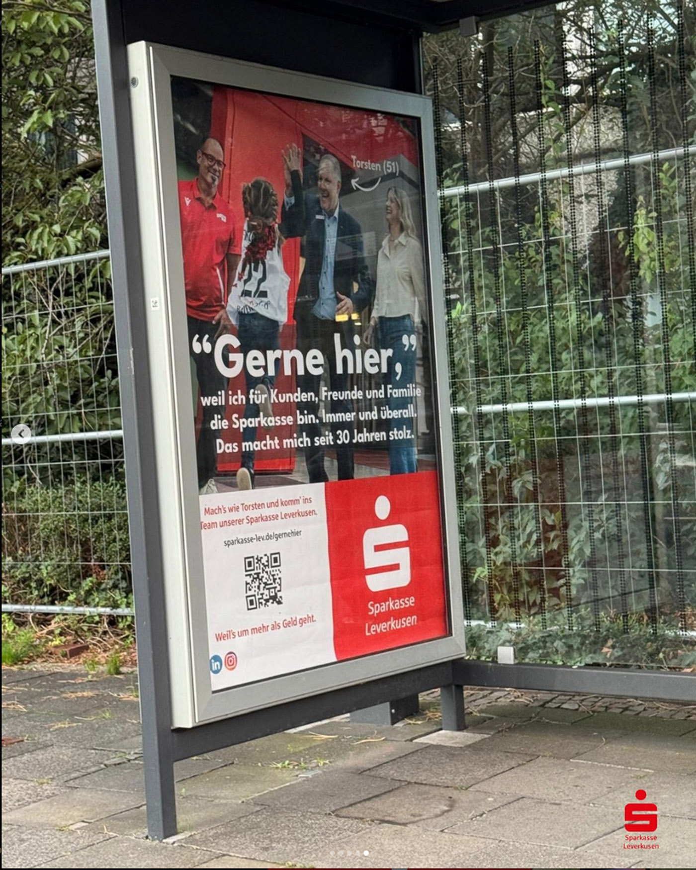 Es war ein besonderer Moment, unsere Fotos überall in der Stadt zu sehen: auf Bannern, Bildschirmen und in Posts, die echte Menschen aus dem Unternehmen zeigen – keine Models, sondern Kolleginnen und Kollegen, die man wirklich trifft, wenn man eine Filiale der Sparkasse Leverkusen betritt.