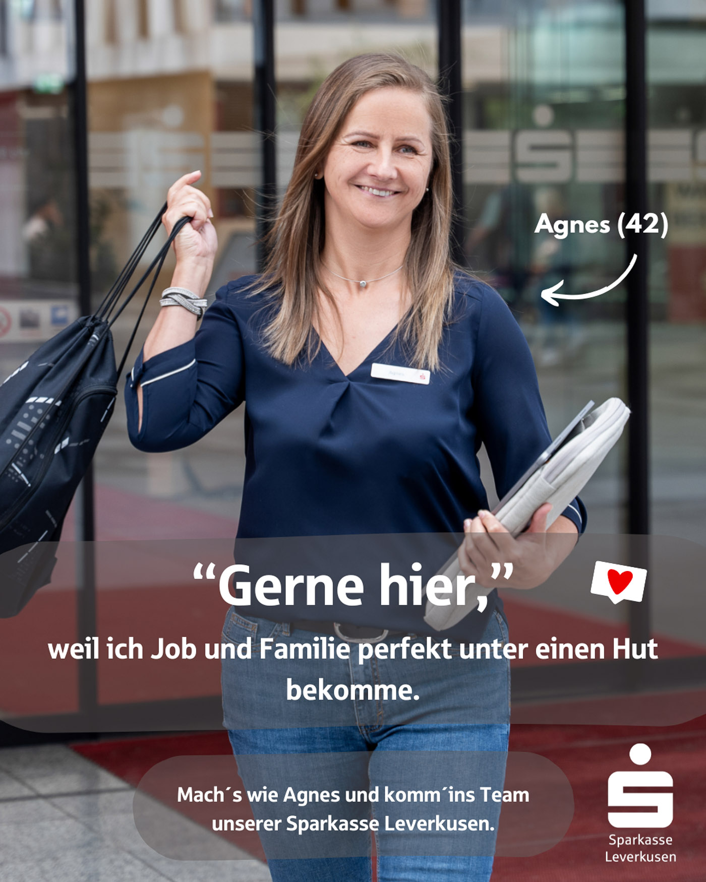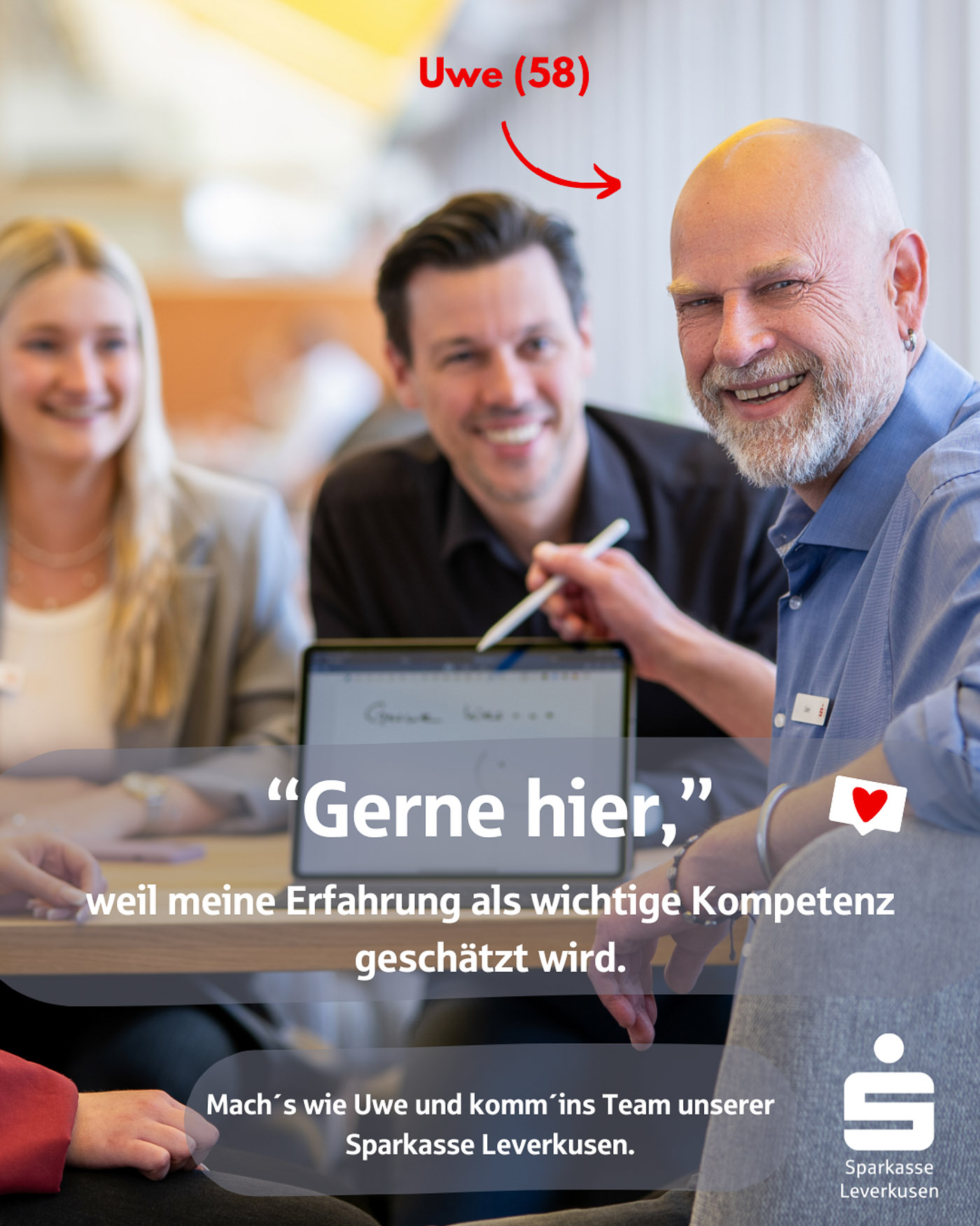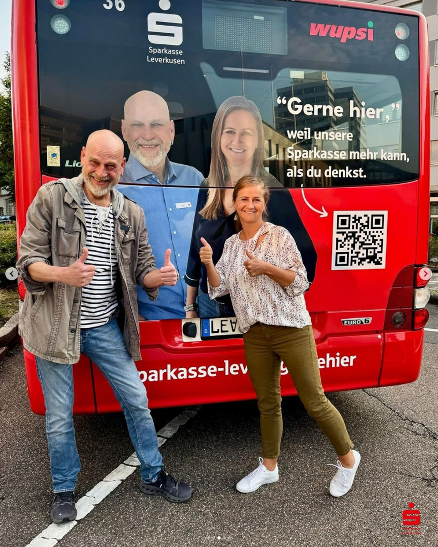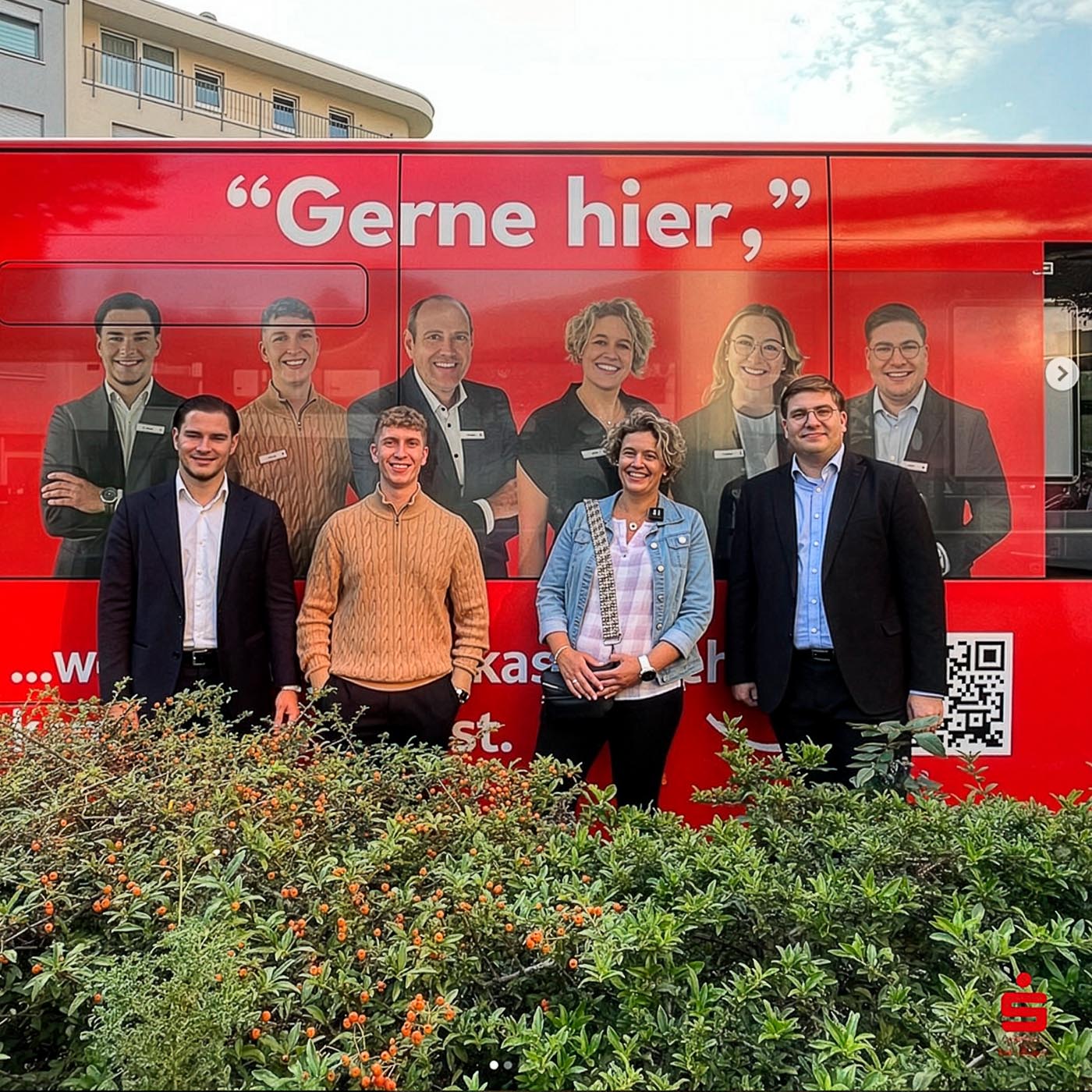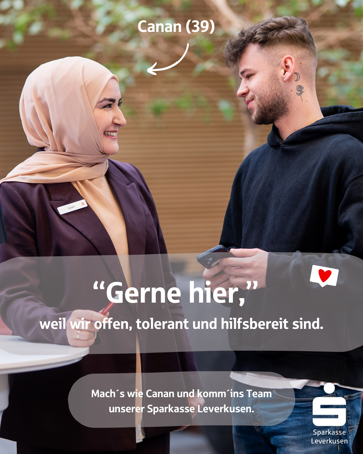 Es war ein besonderer Moment, unsere Fotos überall in der Stadt zu sehen: auf Bannern, Bildschirmen und in Posts, die echte Menschen aus dem Unternehmen zeigen – keine Models, sondern Kolleginnen und Kollegen, die man wirklich trifft, wenn man eine Filiale der Sparkasse Leverkusen betritt.